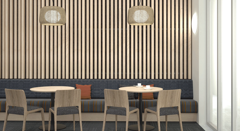 The spray-applied Ecophon Fade provides a smooth, seamless aesthetic acoustic solution on curved and angled surfaces and complex architectural forms, and delivers a Noise Reduction Coefficient (NRC) of 0.80–0.90, depending on coreboard thickness and surface application.