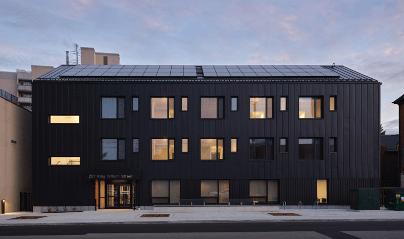 The modular housing project, winner of the Residential (Large) Award in the 2025 SABMag Canadian Green Building Awards, by Montgomery Sisam Architects provides much needed housing by transforming a former surface parking lot into a welcoming and dignified place to call home. The simple building exterior is free from unnecessary jogs or projections, making it easy to detail. The project uses the ThermalWall PH Panel by Legalett Canada which come in R-24, R-28 and R-32 configurations. Sun Glow roller shades in the building feature eco-sustainable technical textiles to filter natural light and moderate indoor temperatures. Ceramic floor tile used in many areas of the interior is by Olympia Tile. Landscaping designed by OMC Landscape Architecture. Ground level cladding between the large windows is board and batten pattern from Marwood Cape Cod Siding.