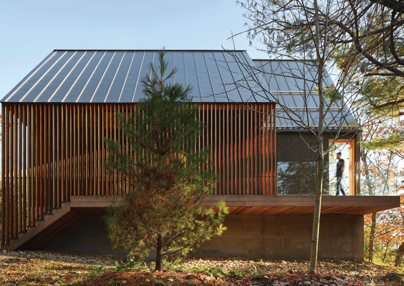 A contemporary interpretation of the traditional A-frame shape evokes the quintessential cabin in the woods, differentiated by shifted roof volumes. Reminiscent of the overlapping layers of rock in the landscape, the split roof design features two intersecting gables that create opportunities for window openings where the roof volumes separate.