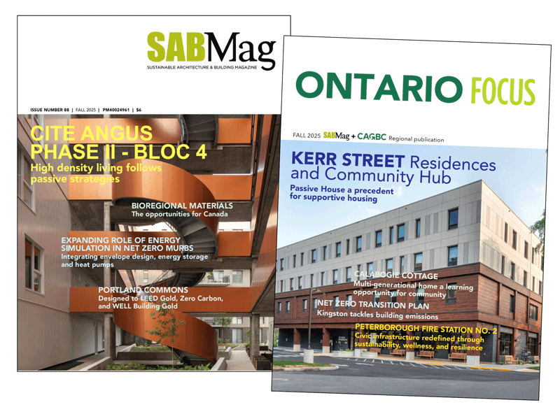 The Fall issues of SABMag and the SABMag/Ontario FOCUS publication, published in association with the CAGBC, inform and inspire with several project profiles and related articles. The Fall SABMag covers the LEED Gold/Zero Carbon Portland Commons project, energy modelling for net zero MURBs, bioregional materials and much more. Ontario FOCUS covers green building as a business, the City of Kingston’s plan to tackle building emissions, and profiles of highly energy-efficient buildings.
