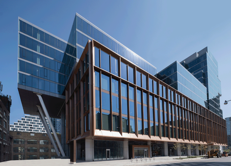 Portland Commons is a high-performance commercial office and retail development, integrating with the surrounding neighbourhood through its preservation of surrounding heritage buildings, terraced massing and activated, pedestrian focussed street presence. It is designed to achieve LEED Platinum (Core + Shell), LEED Zero Carbon, and WELL Building Gold standards, supporting the highest levels of energy efficiency, environmental responsibility, and occupant physical and mental well-being through access to outdoor terraces, biophilic elements, and abundant natural light. Employing Enwave’s Deep Lake Water Cooling system, underfloor air distribution, and high-performance building envelope reduces energy demand to an annual heating and cooling energy intensity of 137 kWh/m² or less. Part of the exterior cladding consists of Vicwest Channel Wall . Interior finished include Quebec Mosaic, Quartz Jambs and Granite Stone by Olympia Tile+Stone and CertainTeed Type X and Acoustic Gypsum Board. Read more …